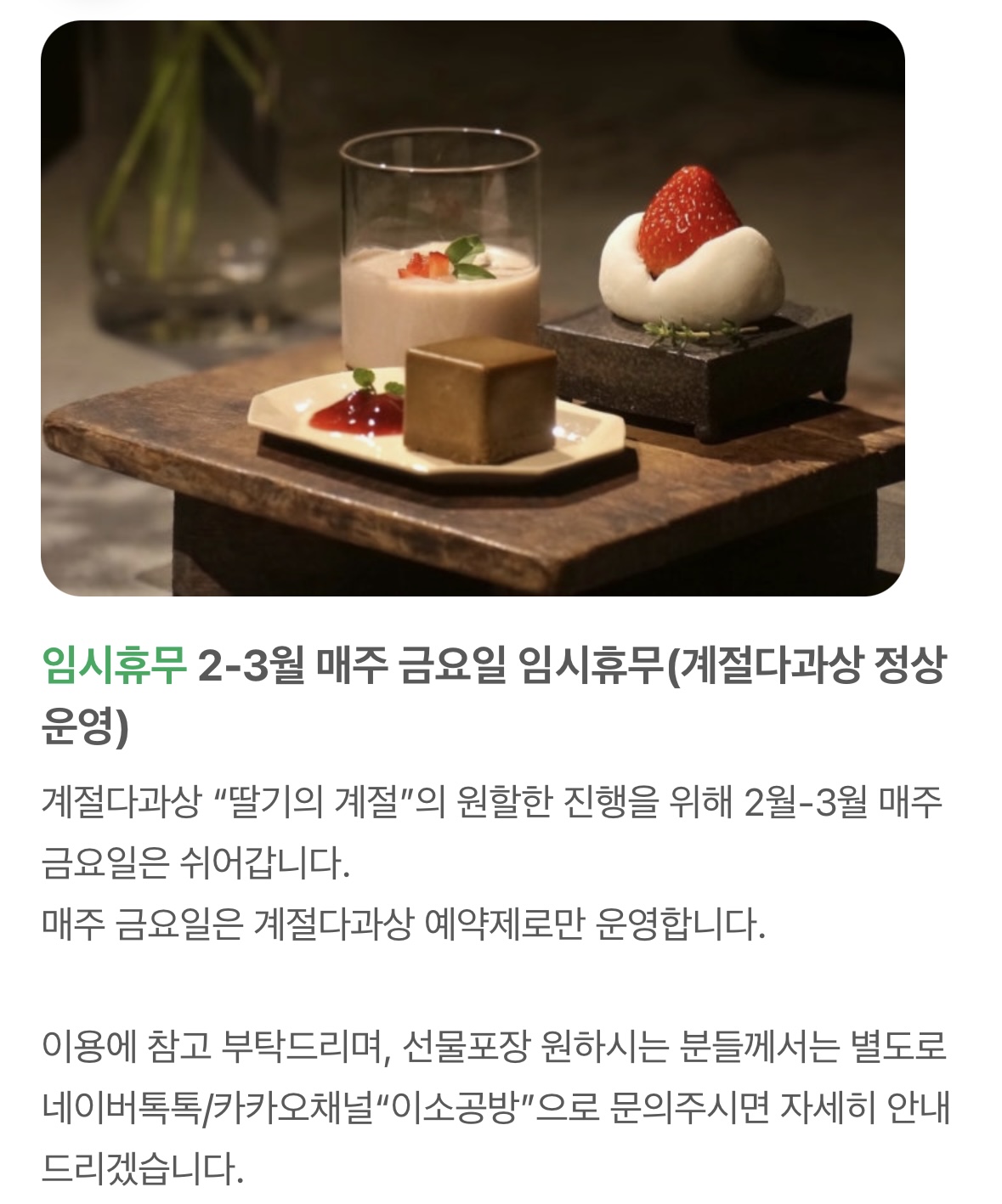 시즌 딸기모찌 5,500 | 시즌 생크림딸기 푸딩 6,000 | 시즌 화과자 5,000 | 차빙수 15,000 | 핸드드립커피 7,000 | 밀크티 8,000 | 미타라시 연두부당고 2꼬치 5,500 | 오늘의 차 7,000 | 티에이드 7,000