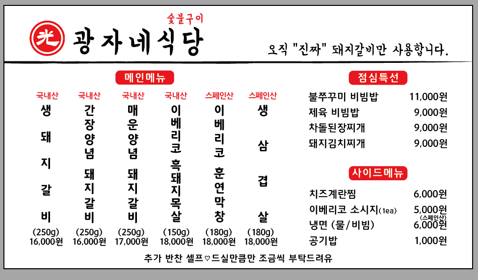 한우살치살100g 25,000 | 한우갈비살100g 21,000 | 한우모듬100g 20,000 | 한우차돌100g 15,000 | 한우안심100g(문의바랑) 25,000 | 한우 새우살 (문의바람) 31,000 | 돼지갈비100g 6,500 | 국내산 가브리살100g 7,000 | 국내산 목살100g 6,500 | 국내 생삼겹100g 6,500 | 한우국밥 10,000 | 한우차돌된장 10,000 | 한우육회비빔밥 10,000 | 도가니탕 13,000 | 냉면(물/비빔) 8,000