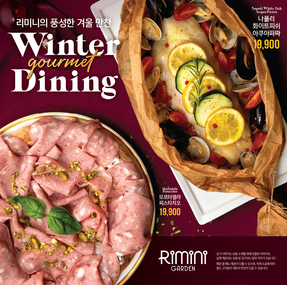 모르타델라 피스타치오 19,900 | 버터 갈릭 먹물 파스타 17,900 | 멜팅치즈 밀푀유 라자냐 17,900 | 골든 펌킨 수프 5,900 | 프리토 미스토 12,900 | 브라운 갈릭버터 컬리플라워 12,900 | 이탈리아 페로니맥주 7,900 | 어린이음료(오렌지&망고맛) 1,900 | 버드와이저(병맥주) 4,900 | 하우스 와인(레드) 2,900 | 레몬 에이드 5,900 | 히비스커스 망고 에이드 5,900 | 매콤 쉬림프 필라프 12,900 | 스테이크 팬 라이스 15,900 | 치킨 버섯 크림 리조또 15,900 | 토마토 바질 관자 리조또 15,900 | 리코타 토마토 샐러드 12,900 | 치킨 텐더 샐러드 12,900 | 리미니 시그니처 콥샐러드 12,900 | 투움바 파스타 15,900 | 관자 바질 페스토 15,900 | 꽃게살 로제 파스타 15,900 | 포모도로 (토마토) 12,900 | 볼로네제 라구 15,900 | 봉골레 알 마레 15,900 | 알리오 올리오 12,900 | 날치알 크림 빠네 15,900 | 클래식 까르보나라 15,900 | 치즈휠 까르보나라 17,900 | 하프 앤 하프 19,900 | 베이컨 빠따떼 17,900 | 마르게리타 17,900 | 콰트로 풍기 17,900 | 디아볼라 초리조 17,900 | 콰트로 포르마지오(고르곤졸라) 17,900 | 리미니 클라시카 17,900 | 하우스 채끝 스테이크 39,900 | 리코타 토마토 샐러드 12,900 | 시칠리아 오렌지 착즙주스 4,900