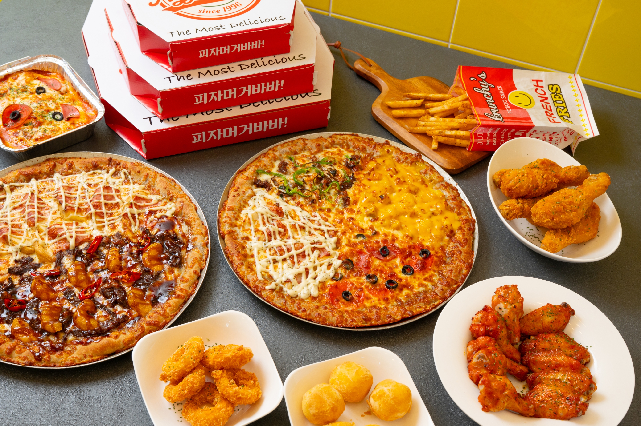 콘치즈피자 10,900 | 프리미엄스테이크피자 15,900 | 지구식단직화피자 12,900 | 크림치즈꽈배기 5,900 | 스리라차마요소스 500 | 치즈피자 8,900 | 페퍼로니피자 9,900 | 콤비네이션피자 10,900 | 고구마피자 10,900 | 핫치킨피자 10,900 | 불고기피자 11,900 | 포테이토피자 11,900 | 나폴리피자 12,900 | 고르곤졸라피자 12,900 | 까르보네피자 12,900 | 아이리쉬포테이토피자 12,900 | 불닭고구마피자 13,900 | 트러플머쉬룸피자 13,900 | 트러플포테이토피자 13,900 | 야채퀘사디아피자 13,900 | 치킨퀘사디아 13,900 | 비프퀘사디아 13,900 | 더블갈릭바베큐피자 13,900 | 직화파인애플피자 13,900 | 깐쇼새우피자 14,900 | 닭안심살피자 14,900 | 직화홀릭바이트피자 14,900 | 도이치바이트피자 14,900 | 멕시칸바이트피자 14,900 | 오지치즈포테이토피자 14,900 | 미트러버피자 15,900 | 크림스파게티 6,900 | 오지치즈그라탕 6,900 | 치즈오븐스파게티 6,900 | 치킨스틱&윙 6,900 | 치킨텐더 5,900 | 새우링 5,900 | 트러플포테이토스틱 4,900 | 갈릭포테이토 4,900 | 크림치즈볼 4,900