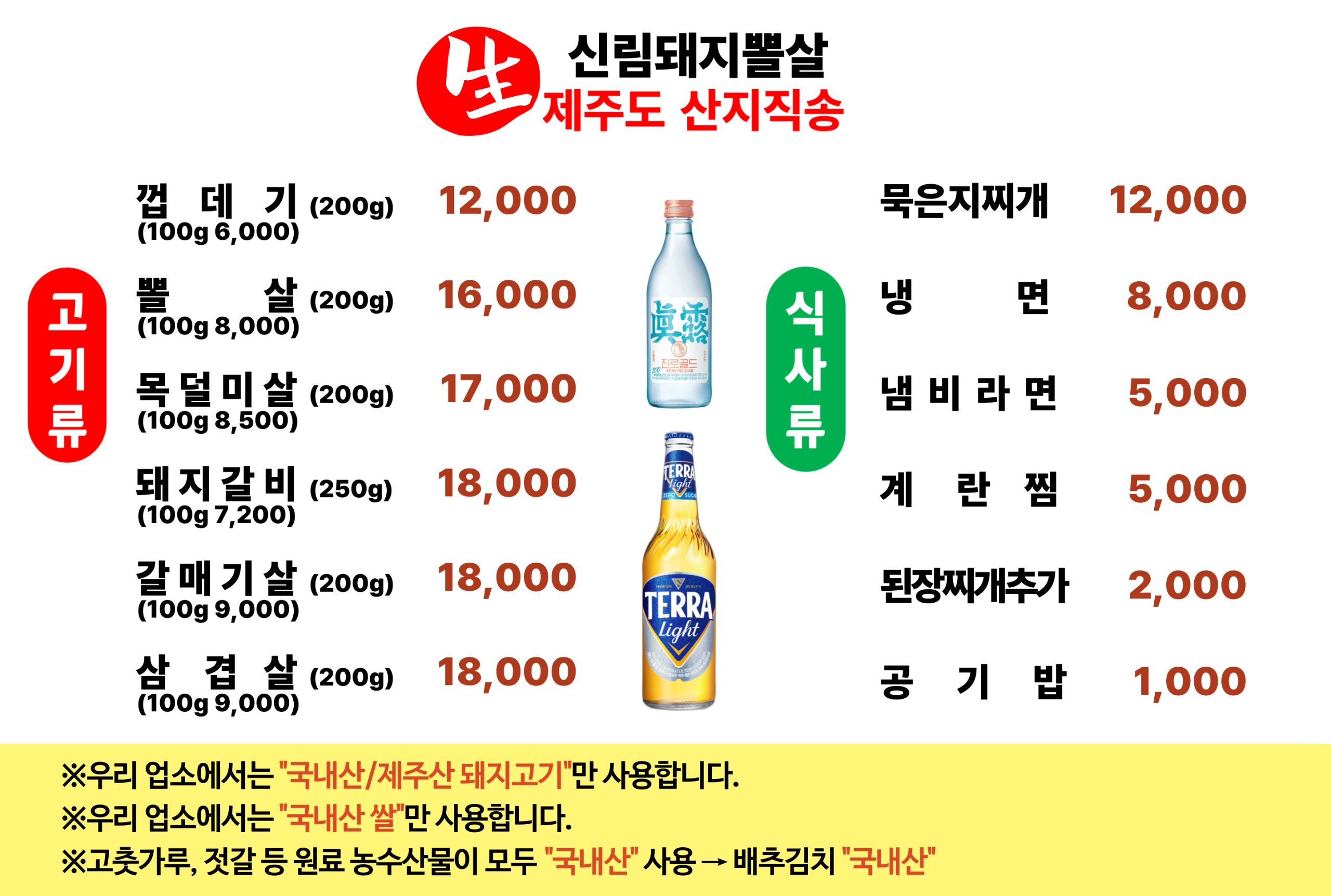 껍데기 12,000 | 뽈살 16,000 | 목덜미살 17,000 | 갈매기살 18,000 | 돼지갈비 18,000 | 오겹살 18,000 | 묵은지찌개 12,000 | 냉면 8,000 | 계란찜 5,000 | 냄비라면 5,000