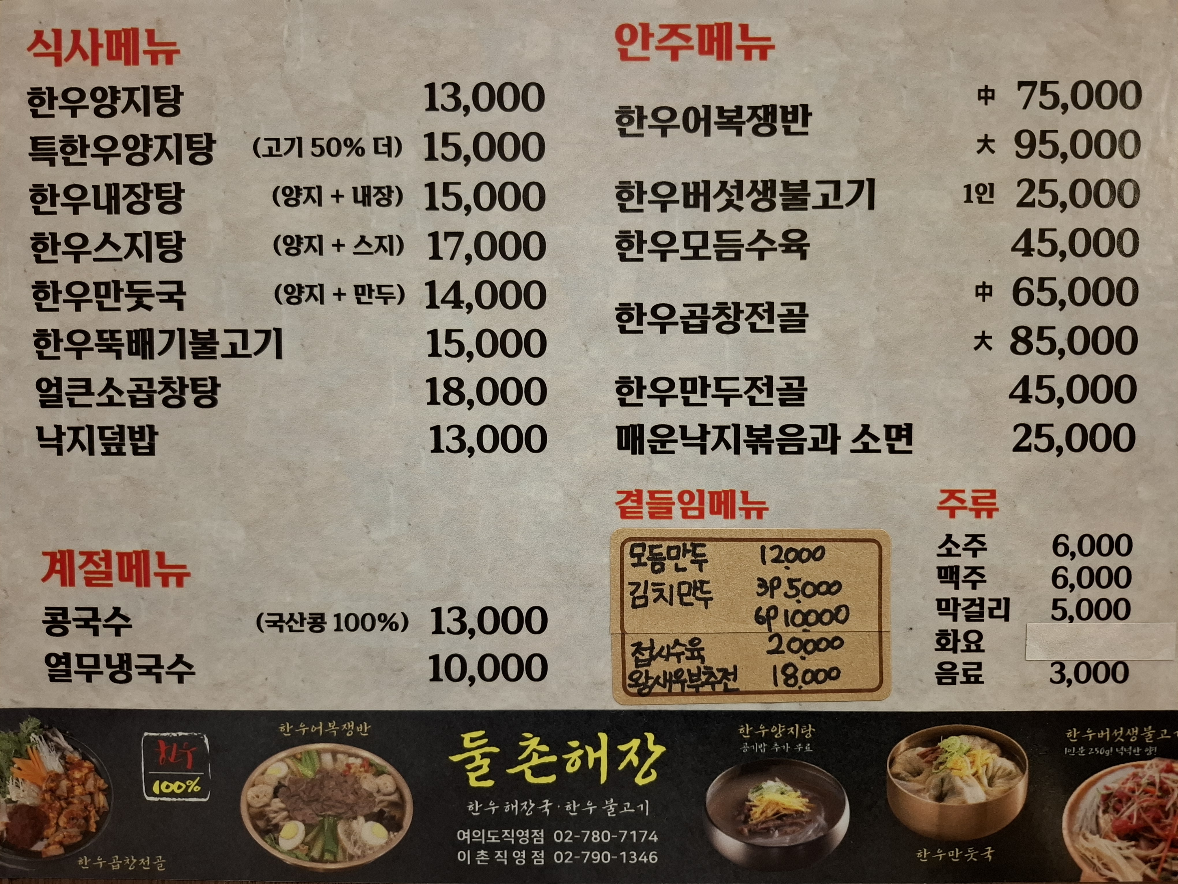 한우양지탕 13,000 | 한우모듬수육 45,000 | 한우스지탕 17,000 | 얼큰소곱창탕 18,000 | 낙지볶음과 소면 25,000 | 김치손만두 10,000 | 한우곱창전골 65,000 | 한우만두전골 45,000 | 접시수육 20,000 | 한우만두국 14,000