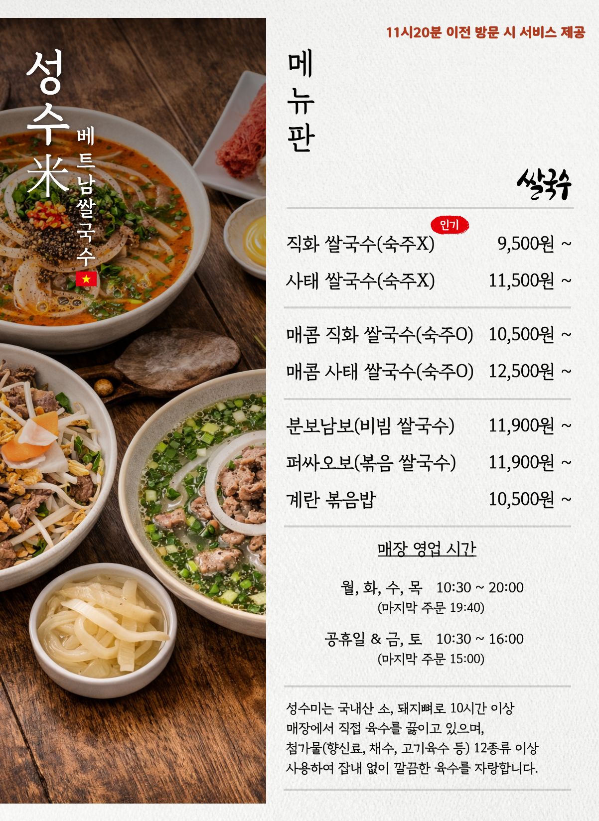 직화 쌀국수(숙주X) 9,500 | 사태 쌀국수(숙주X) 11,500 | 매콤 직화 쌀국수(숙주O) 10,500 | 매콤 사태 쌀국수(숙주O) 12,500 | 분보남보(비빔 쌀국수) 11,900 | 퍼싸오보(볶음 쌀국수) 11,900 | 계란 볶음밥 10,500
