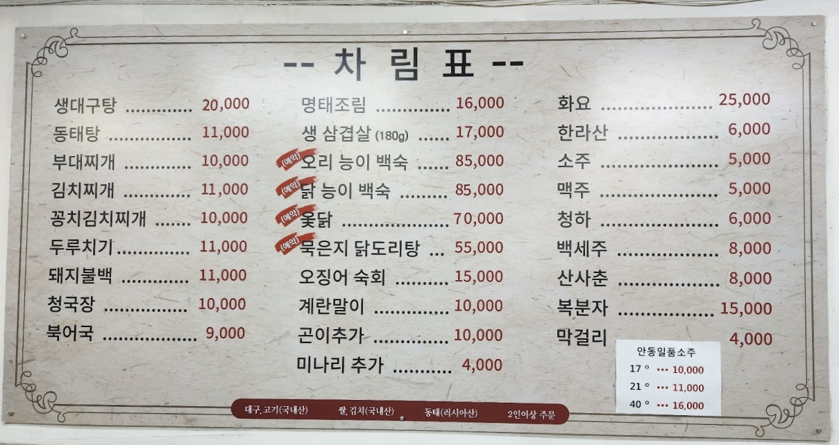 생대구탕 20,000 | 동태탕 11,000 | 부대찌개 10,000