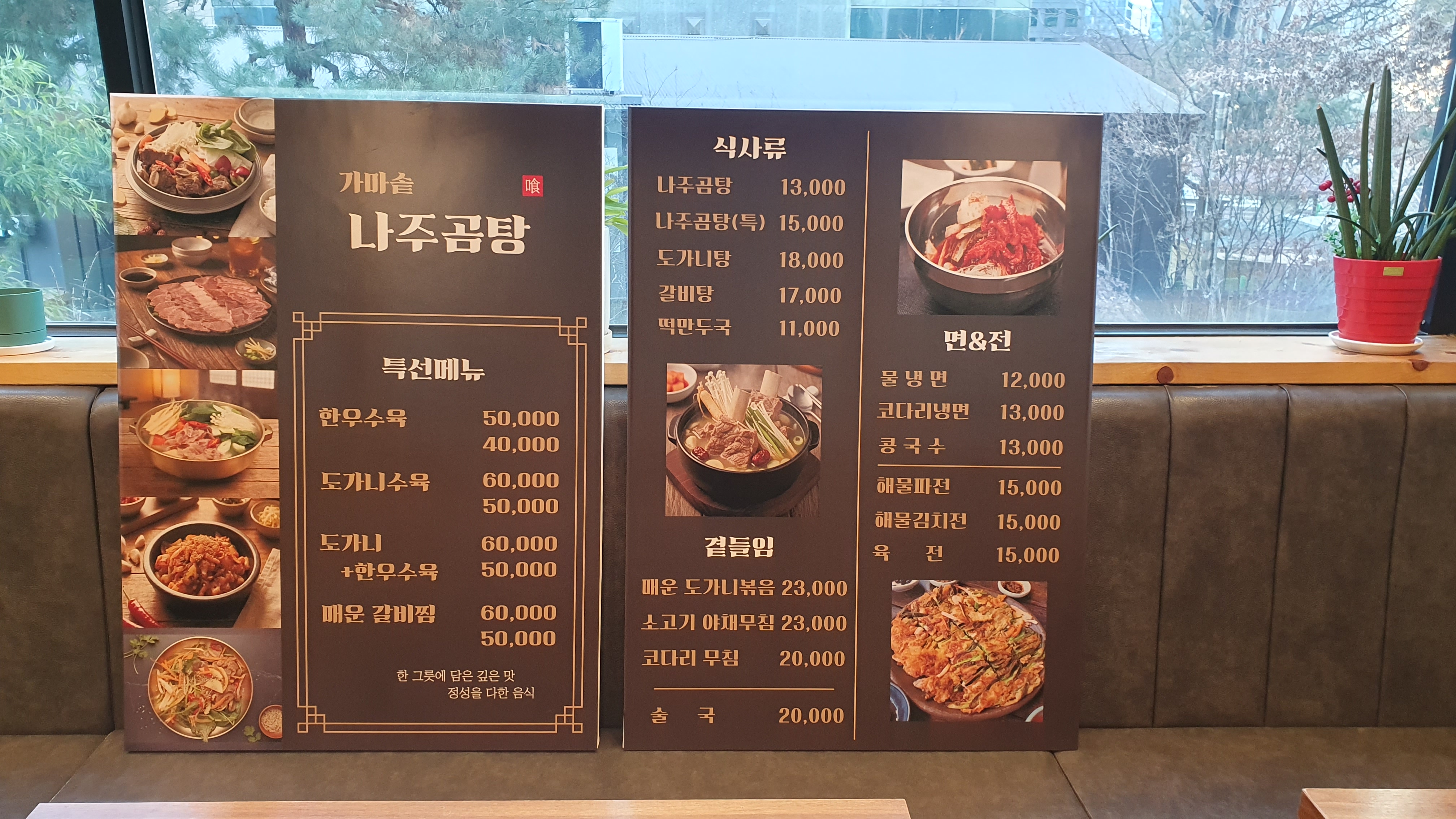 나주곰탕 13,000 | 도가니탕 15,000 | 영양 갈비탕 17,000 | 한상차림4인코스 130,000 | 육전 15,000 | 해물김치전 15,000 | 해물파전 15,000 | 도가니수육 50,000 | 한우수육 40,000 | 매운갈비찜 50,000 | 매운도가니볶음 23,000 | 매운갈비조림 35,000 | 소고기야채무침 23,000 | 코다리무침 20,000 | 떡만두국 11,000 | 코다리냉면 13,000 | 콩국수 13,000